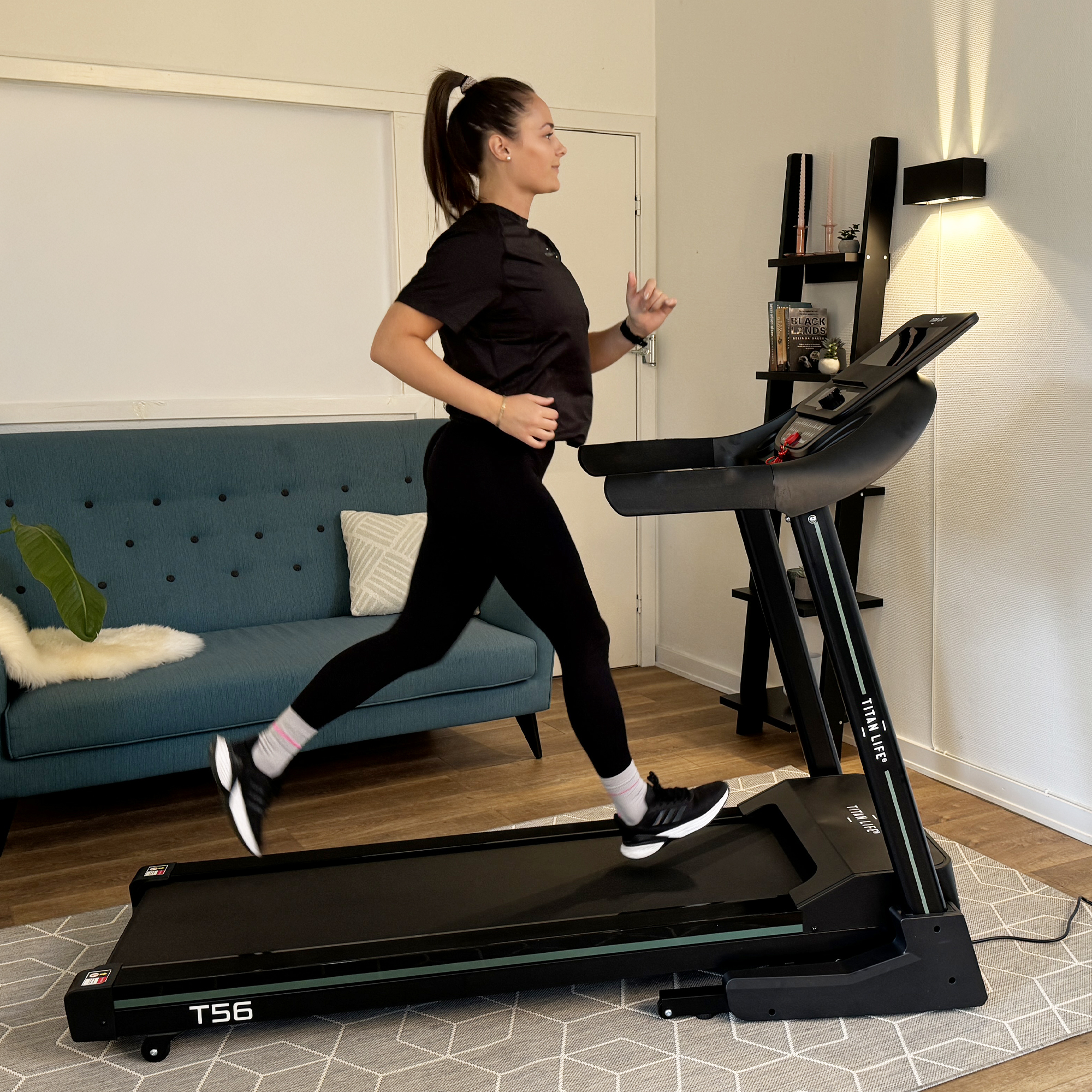 TITAN LIFE Treadmill T56 er designet for å gjøre treningen din mer effektiv og underholdende, enten du er en nybegynner eller en erfaren løper. Praktiske funksjoner som en tabletholder, flaskeholder og transporthjul gjør tredemøllen enkel å bruke og oppbevare. Dessuten er 95% av tredemøllen forhåndsmontert fra fabrikken, så du raskt kan komme i gang med treningen din.